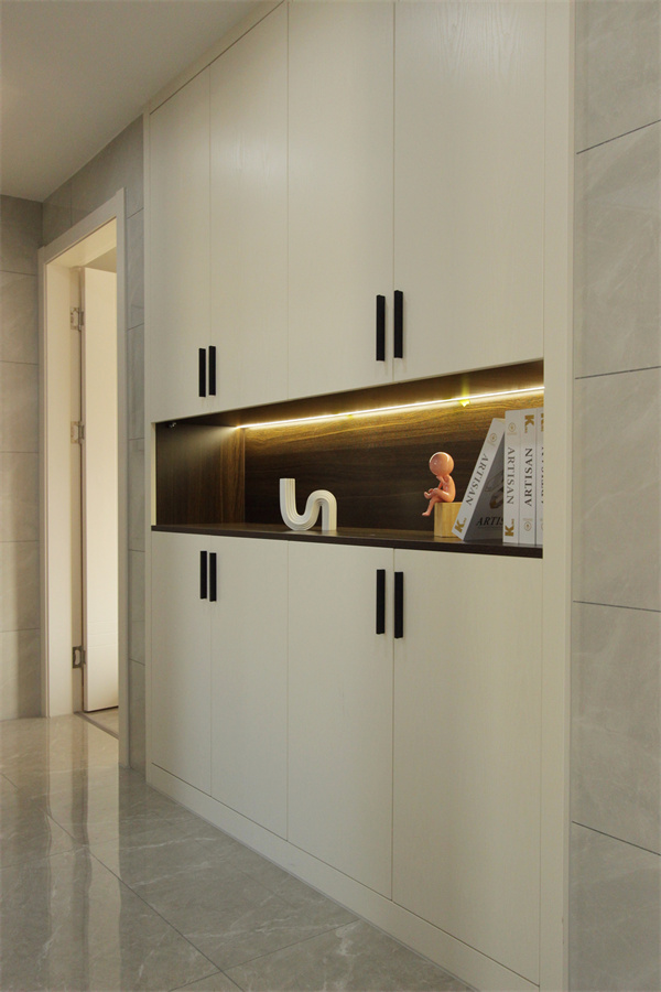 入戶玄關(guān)是過渡到客廳、餐廳的空間,根據(jù)業(yè)主的喜好定制了一整面嵌入式玄關(guān)柜,中空隔斷內(nèi)嵌燈帶照明裝飾,讓回家可以充滿儀式感~