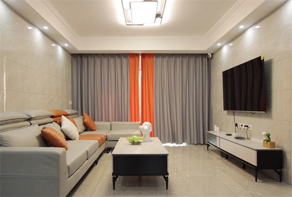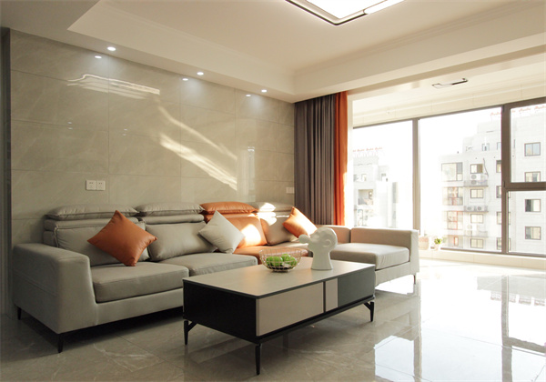 客餐廳互通,墻地面整體采用大理石,顯得空間既有通透感,并且也讓空間看起來更加明亮。客廳配色是大面積的灰色,墻地磚、沙發(fā)、窗簾等都是不同明度的灰,加入橙色的點(diǎn)綴打破沉悶。