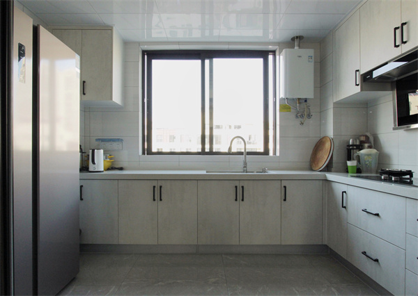 廚房采用L型的臺(tái)面,一側(cè)放置冰箱。洗、切區(qū)域規(guī)劃到了靠窗的位置,既能有效通風(fēng)并且光線也足夠,炒區(qū)在另一側(cè),使分工區(qū)域更加明確。廚房也貫徹整屋現(xiàn)代風(fēng)的路線,黑白的配色,會(huì)感覺非常的整潔干凈,也方便日常打理。