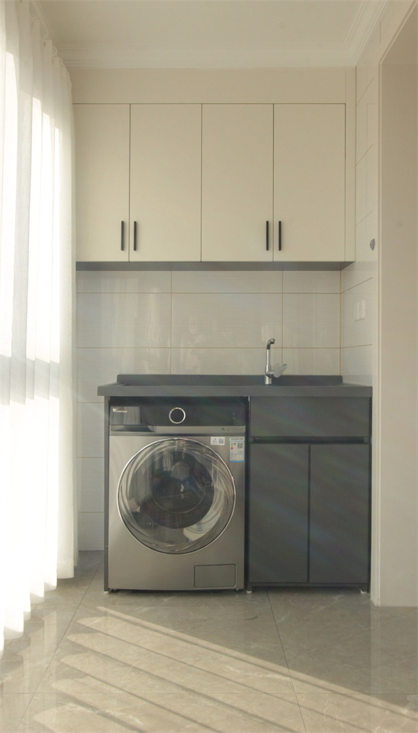 陽臺(tái)不僅有嵌入洗衣機(jī)的地柜,還加入了吊柜,增加儲(chǔ)物空間的同時(shí),也讓陽臺(tái)看起來更具整體感。陽臺(tái)區(qū)域打通,連接著次臥與客廳,通透式陽臺(tái)顯得空間更加寬敞通透。