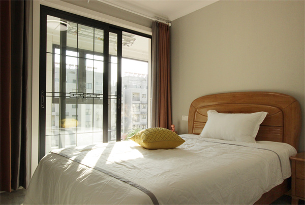 陽臺(tái)連通著次臥,作為客房的使用,不必裝修的太過繁華,透過窗外的陽光灑進(jìn)屋內(nèi),使得居室更加溫馨。次臥的風(fēng)格還是現(xiàn)代簡(jiǎn)約風(fēng),整體配色淡雅,窗簾采用的是藕粉色及灰色。