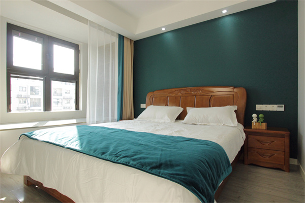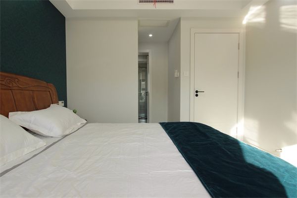主臥整體配色簡(jiǎn)約時(shí)尚,飄窗空間合理運(yùn)用,設(shè)計(jì)了開放式的收納柜,完美的利用空間。空間配色以清新的綠色搭配純潔的白色,淺色窗簾的融入讓空間看上去素雅明亮。沒有繁雜的設(shè)計(jì),只為還原最舒適的舒眠空間。