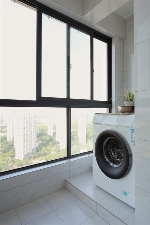 洗衣房空間不大,卻也是獨立空間,整面墻的大窗,為客廳納入足夠自然光,也使得整體空間南北通透。