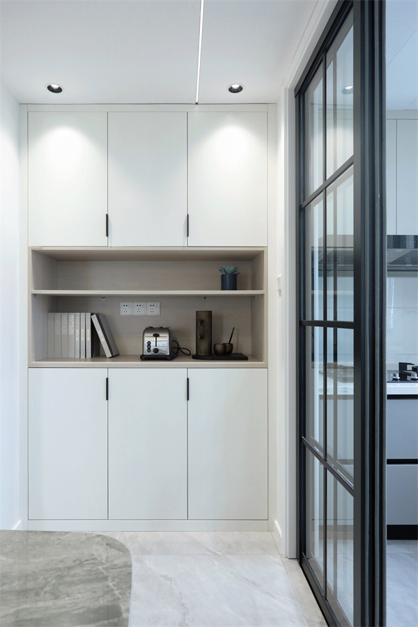 餐邊柜連靠墻設計,利用玄關背部與廚房之間的立面空間,干凈素雅,將雜亂藏進其中。