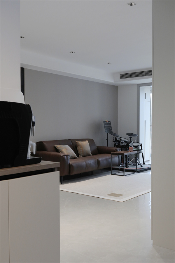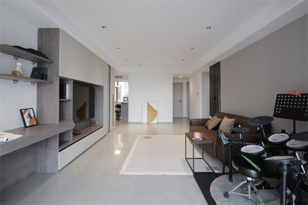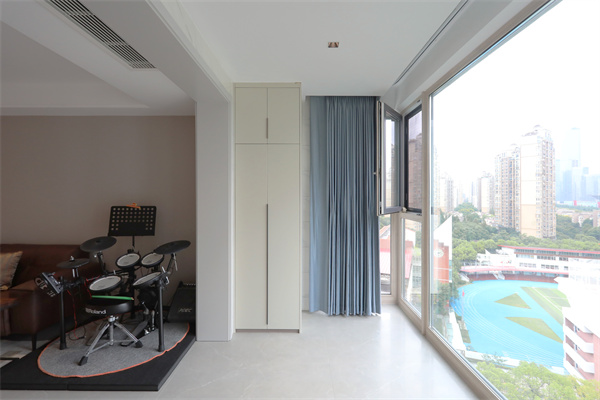 快節奏的都市中,生活更需要慢下來,沙發一側擺放孩子每天都要練習的架子鼓。