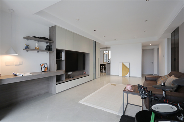 電視柜做整面墻的設計,使之擁有充足的收納空間,定制電視柜連接一側的書桌,讓空間更加的整體化。