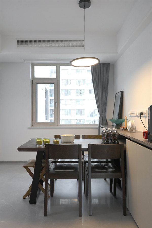 定制餐邊柜正好可以將餐桌推進去,平日里一家三口用餐十分方便。