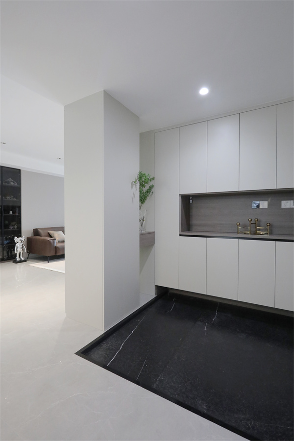 玄關區域地面采用黑色地磚,高度下沉5公分,進門更有儀式感。