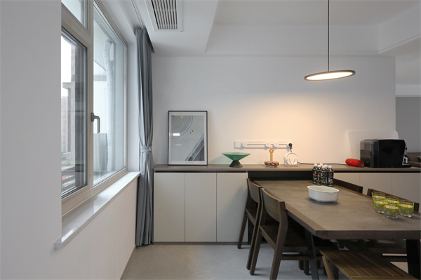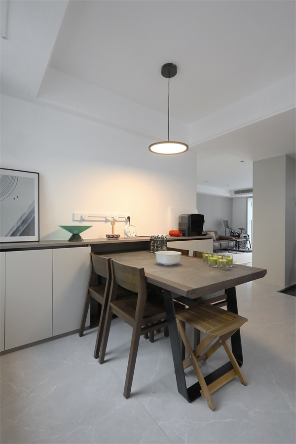 半高的定制餐邊柜使餐廳空間更加明亮,與客廳相呼應的色調,營造出沉穩的空間氣質。