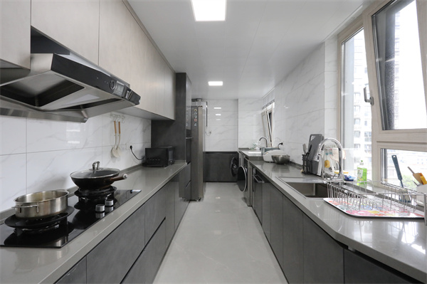 廚房空間根據原始戶型設計,兩側靠邊做廚柜,根據主人的烹飪習慣定制動線。