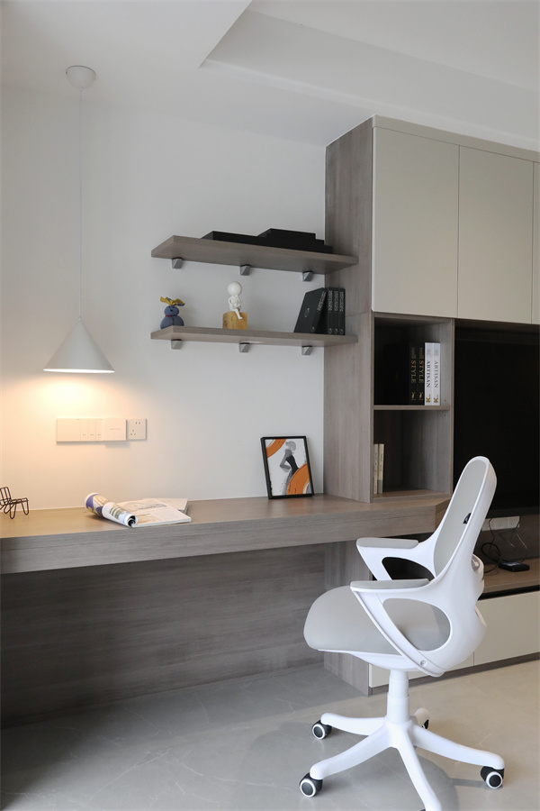 書桌利用錐形吊燈增加局部照明,彌補了背光空間里的光線不足,也避免過高的亮度影響客廳整體的寧靜氣息。