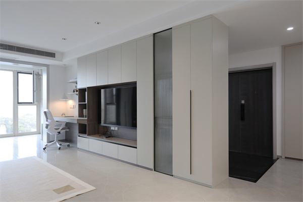 一體化的電視柜,也為玄關做了空間隔斷,擴大收納的同時,增加了區域的邊界感。