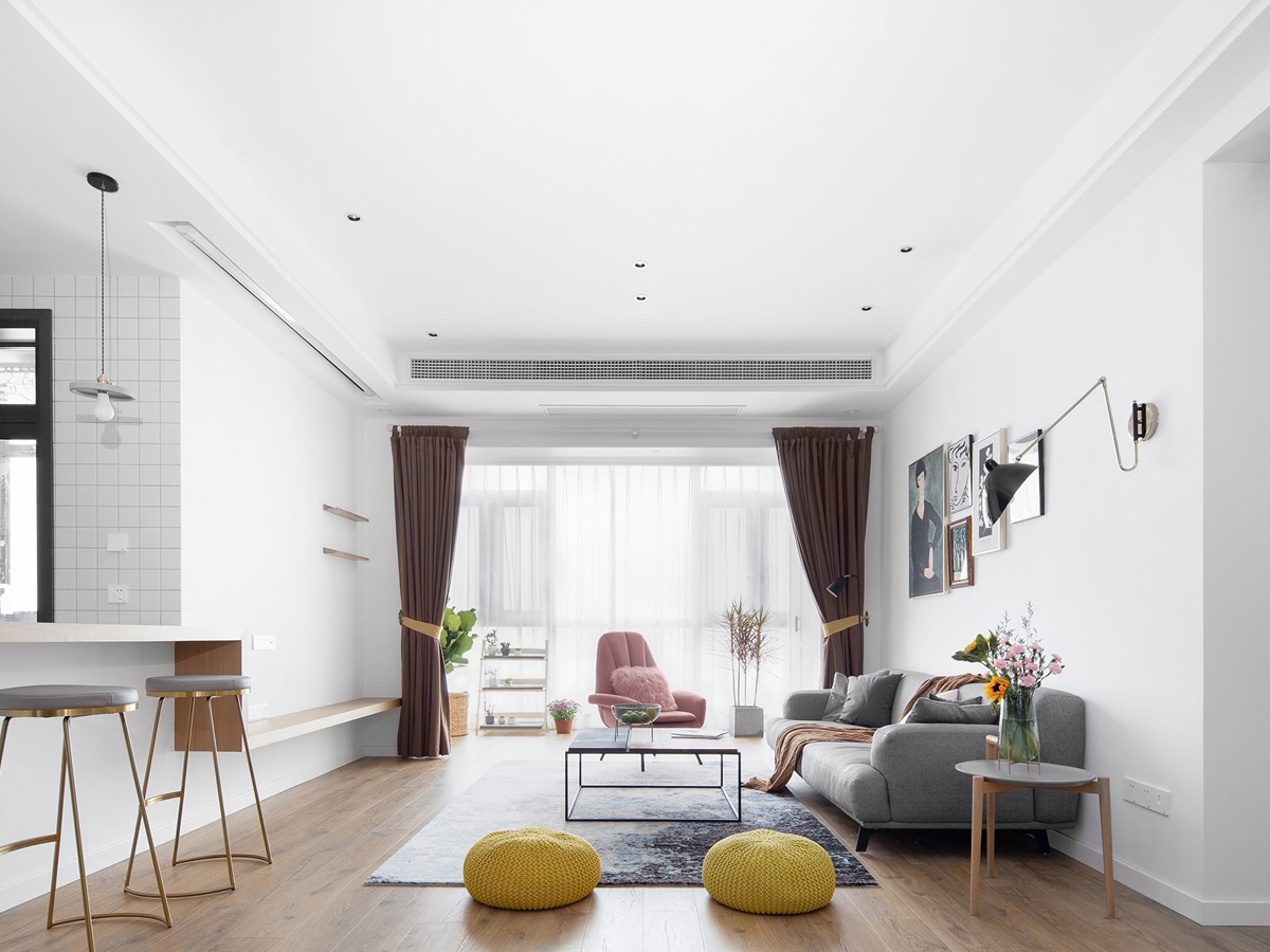 客廳部份地面已大面積地板為主,餐桌及椅子也是以實木為主,茶幾的搭配也是實木和素水泥的搭配,顯得空間更有質(zhì)感。拿掉電視背景墻來做吧臺,使得廚房和客廳的連接更加有趣,因為現(xiàn)在大部分家庭都不在客廳看電視,所以也就弱化電視的功能。在做飯洗菜的時候和客廳的空間互動,也是另外一種感覺。軟裝搭配更多的是自由,隨性。