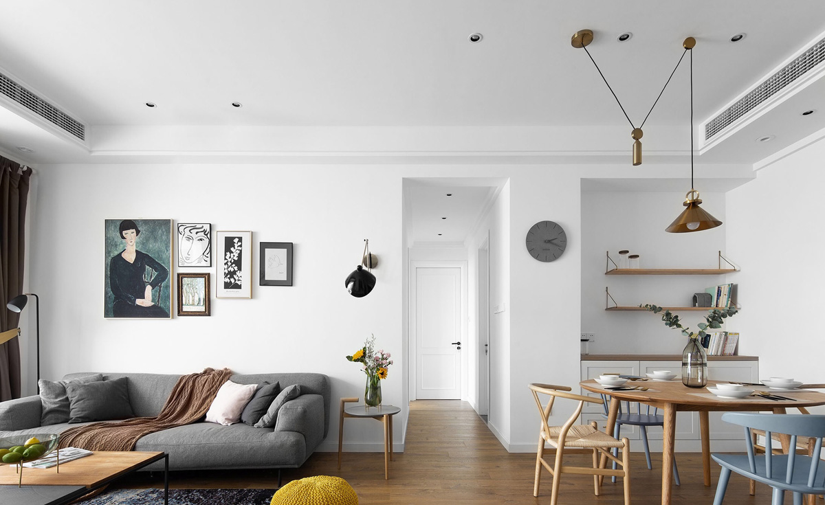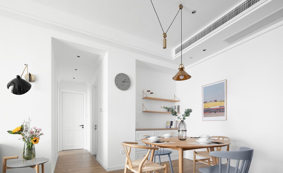 餐廳的設(shè)計墻面全部刷白色乳膠漆,從衛(wèi)生間偷出來的餐邊柜功能也非常實用。