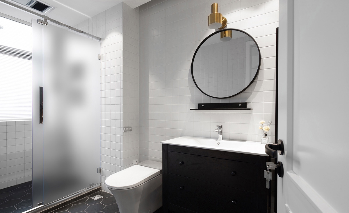衛(wèi)生間以黑色金色為基調(diào),洗臉柜及鏡子是到網(wǎng)上淘的,質(zhì)量也還不錯。