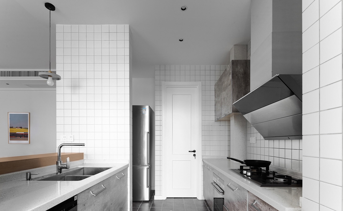 廚房的搭配以自然色位置,墻面是10*10白色小白磚,地面是30*30的黑色磚,廚柜是防水泥色的門板,廚房旁邊設(shè)計了一個雜物間兼食品柜,對于居家家庭來說是一個必不可少的空間。