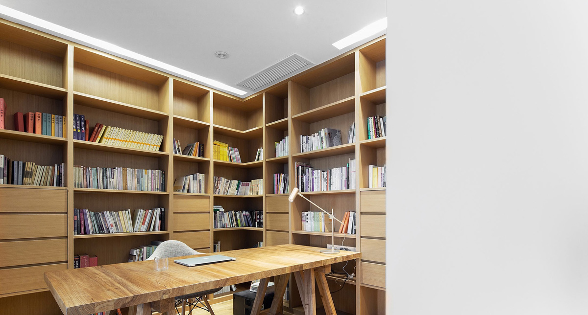 書房是業(yè)主使用頻率最高的地方,柜子也是設(shè)計好現(xiàn)場制作的,滿足要放打印機和抽屜,各個高度書籍的功能,色調(diào)以原木為主。