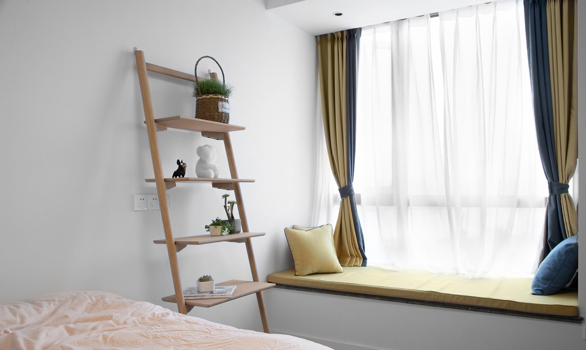 主臥室用了一張榆木的床,配了素色的床品,干凈有質(zhì)感,墻面上的裝飾畫用一幅圓形的云霧山畫,讓臥室顯得更加有意境,臥室和書房之間是用了一個窄邊框的玻璃門來做隔斷,開空調(diào)的時候更加節(jié)能。